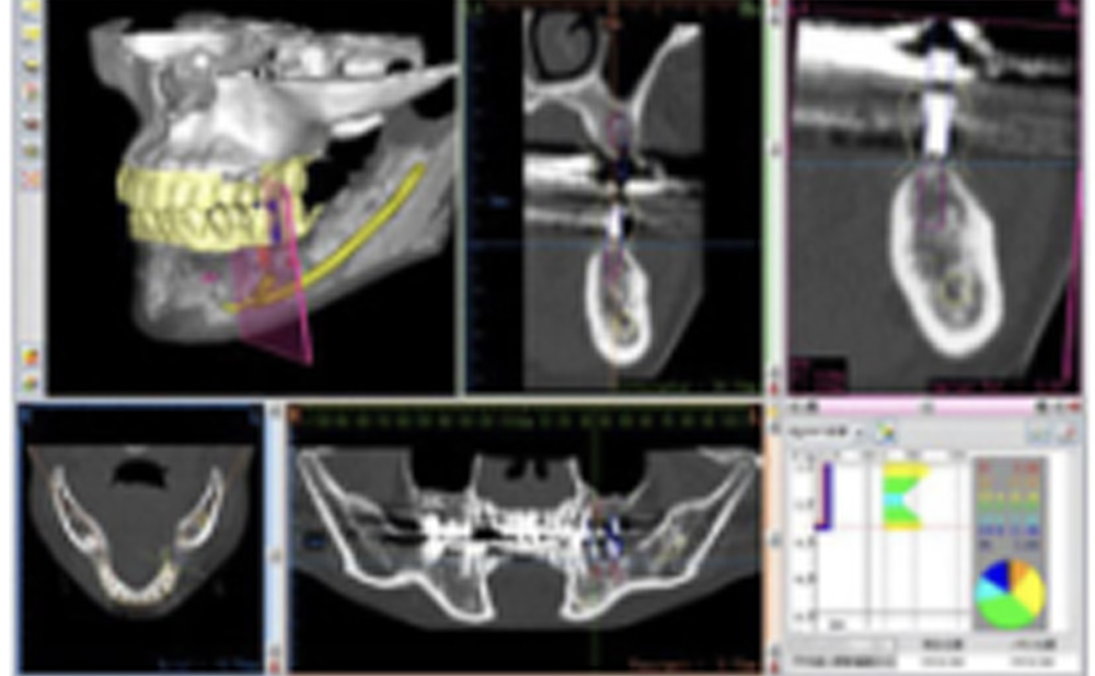 歯科専用CT装置で撮影した画像から作製したお口の3D画像を使い、コンピューター画面上で手術のシミュレーションを行うことができます。インプラントを埋め込む適切な位置や角度、人工歯の形状などを術前に締密にシミュレーションすることができ、治療の安全性と質を高められます。