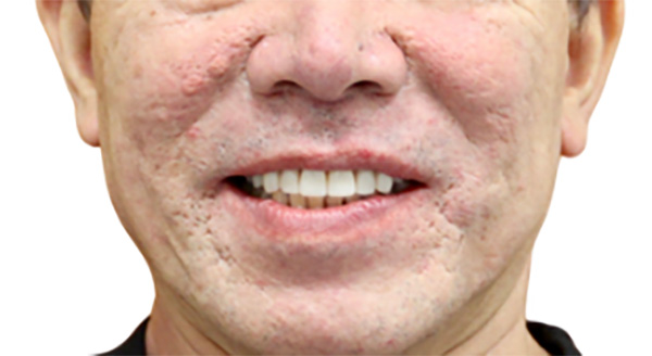 4本のインプラントで10〜12本の人工歯をしっかり支えるので、入れ歯のような違和感が少なくなります。また、一度にすべての人工歯を作成するため、歯の色や歯並び、歯茎の自然な膨らみなど、元々の歯のような美しい見た目の再現が可能です。