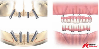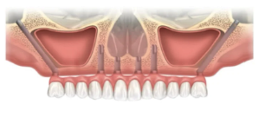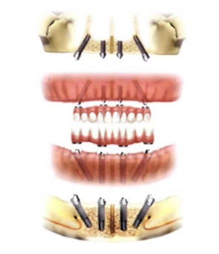 - 片顎につき4本のインプラントを埋入して10〜12本の歯を支える