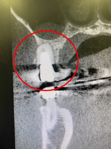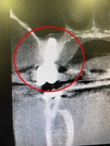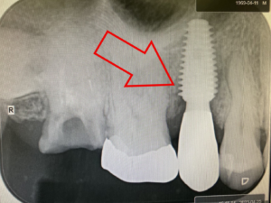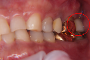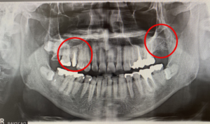 こちらが治療前のレントゲン写真です。丸を付けた箇所がインプラント治療を受ける場所です。