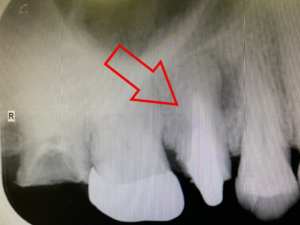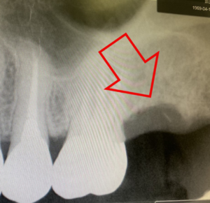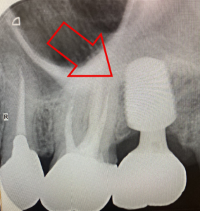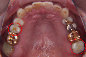 左の赤丸は、虫歯の為、歯の根っこが悪くなり抜歯が必要な場所です。(右上4番)